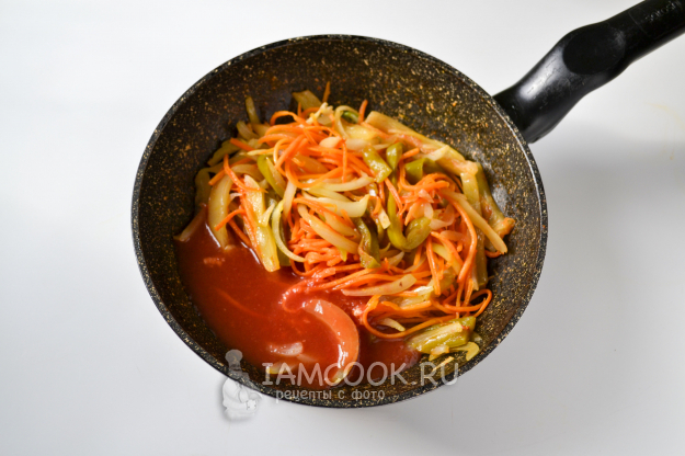 Влейте томатный соус (лечо). Перемешайте. Добавьте соль. Имейте в виду, что лечо и соевый соус соленые.