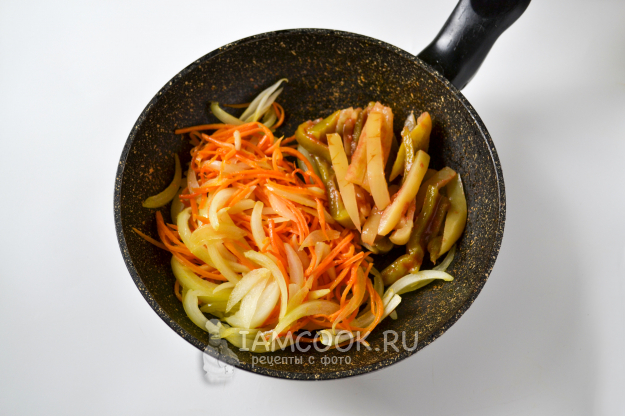 Перемешайте морковь и лук, жарьте еще 2-3 минуты. Добавьте нарезанный перец. Перемешайте, жарьте еще пару минут.