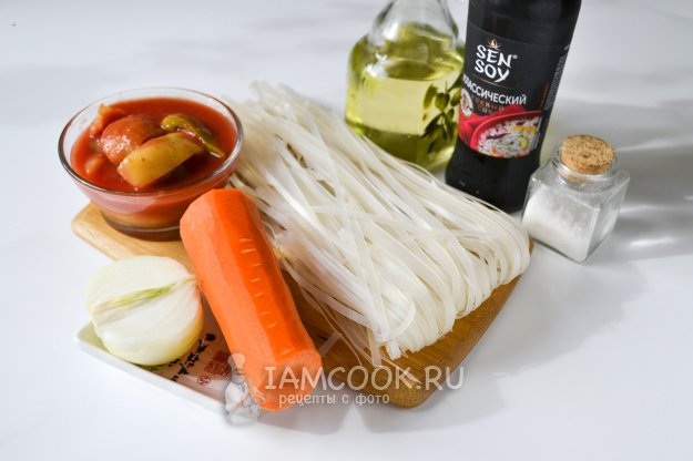 Соберите продукты для приготовления рисовой лапши с овощами в соевом соусе. Морковь и лук вымойте и почистите.
