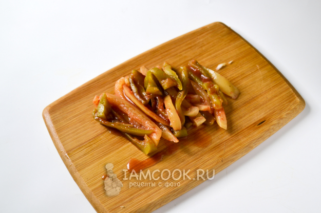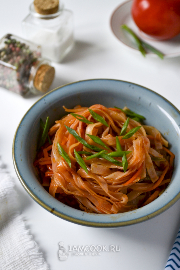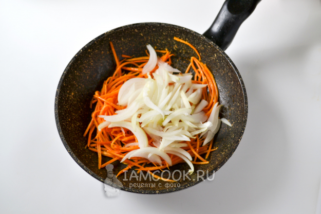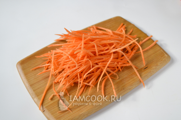 Морковь нарежьте тонкой длинной соломкой или натрите на терке для корейских салатов.