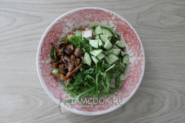 Добавьте кусочки огурца, руколу и жареные шампики.