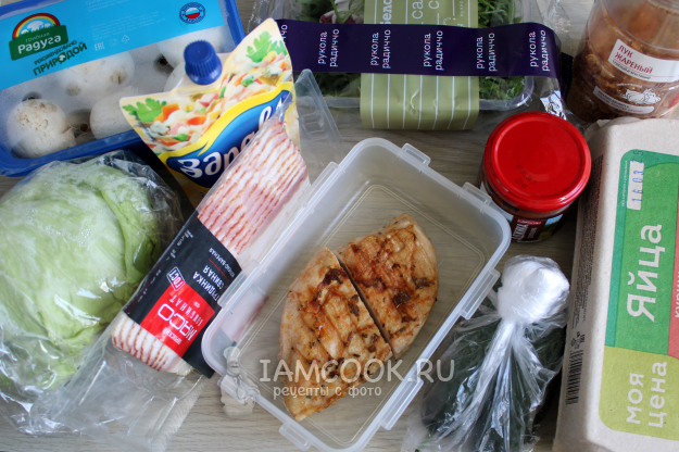 Для салата с луком фри и курицей (с беконом) подготовьте ингредиенты по списку к рецепту. Сразу скажу, что количество ингредиентов может варьироваться на ваш вкус или по наличию. Например, готовила три порции, но одну - без грибов. Кроме айсберга и руколы, подходят и другие листовые салаты (фризе, радиччио, дубок и т.п.) и салатные травки (шпинат, мангольд и т.п.).
