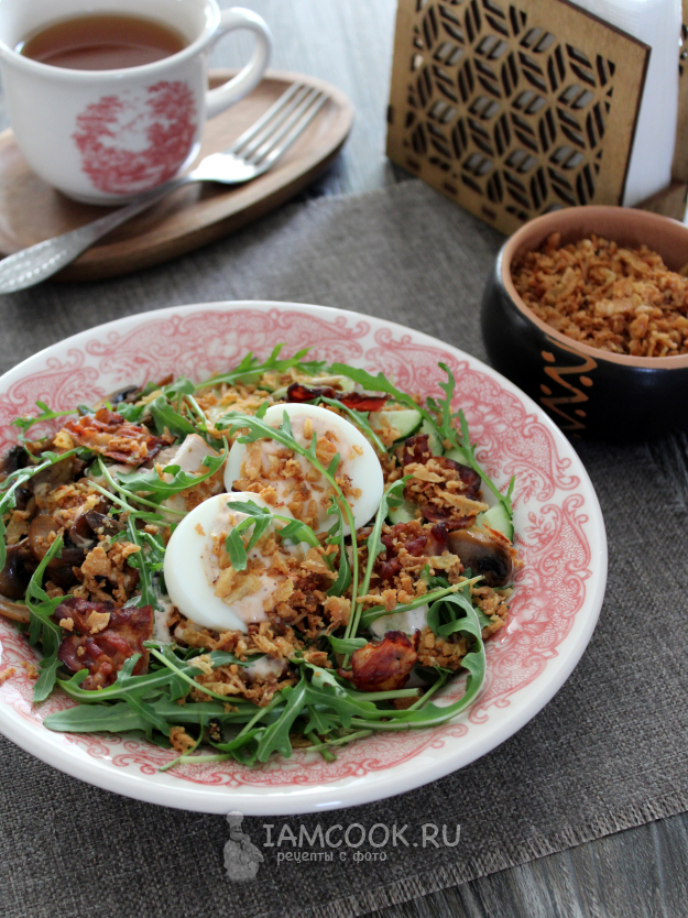 Салат с курицей, беконом и луком фри - сытный, вкусный и даже эффектный.
