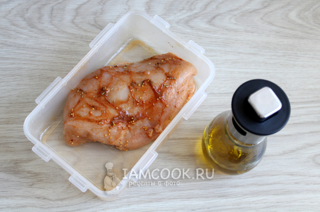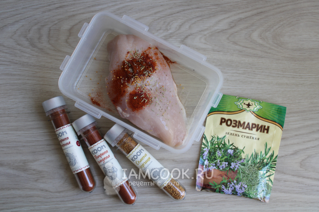 Куриную грудку натрите всеми указанными специями, солью и оливковым маслом.