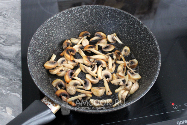 Шампиньоны нарежьте тонкими ломтиками и жарьте на сливочном или растительном масле при помешивании на среднем огне до уменьшения в размерах - выпаривания влаги.