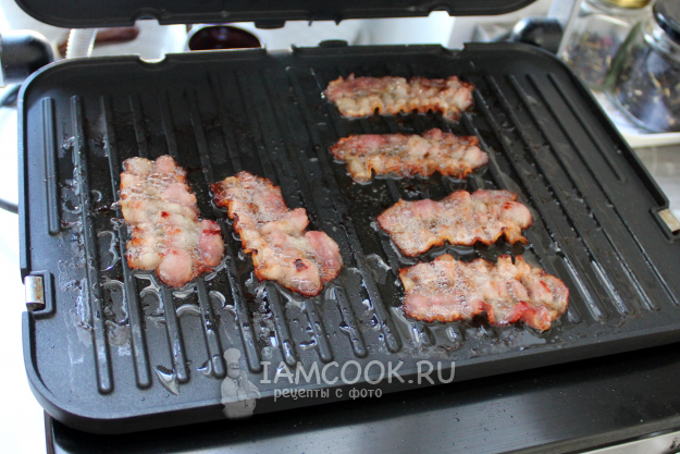 Бекон тоже нужно поджарить с двух сторон на сковороде или на электрогриле.