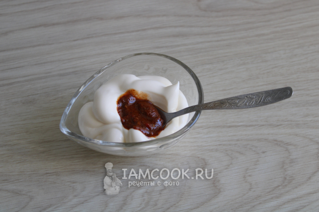 Для заправки перемешайте майонез с соусом аджика, пробуйте и регулируйте остроту по вкусу. Дайте настояться минимум полчаса, храните в холодильнике.