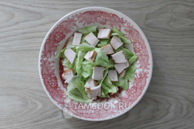 На дно салатника уложите порванный свежий листовой салат и нарезанную ароматную куриную грудку.