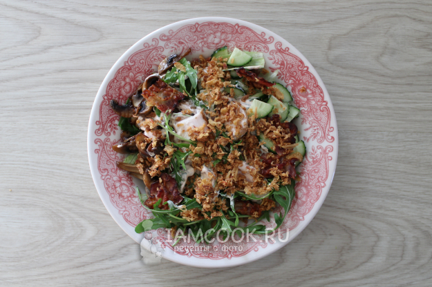 Соберите салат в общем салатнике или порционно. У меня порционно: одна - на пошаговых фото, вторая - без шампиньонов, в третьей - больше бекона.