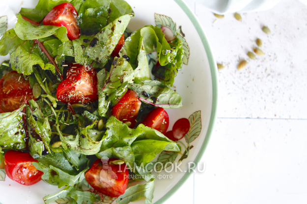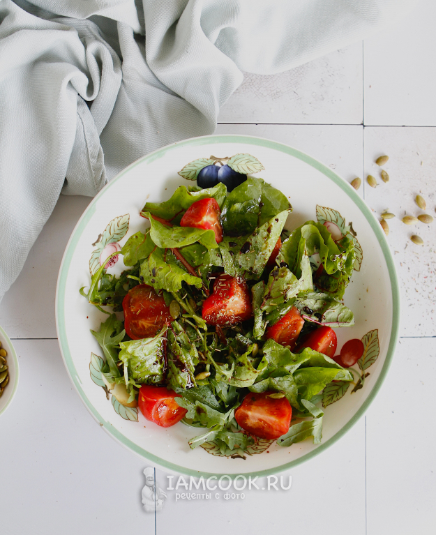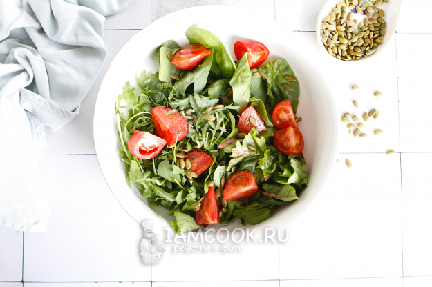 Минимум манипуляций - и получилось беспроигрышное сочетание, на мой взгляд. Вся зелень: шпинат, руккола и мангольд отлично миксуются между собой. На фоне зелени помидоры создают яркую палитру, а тыквенные семечки и заправка придают изюминку салату.