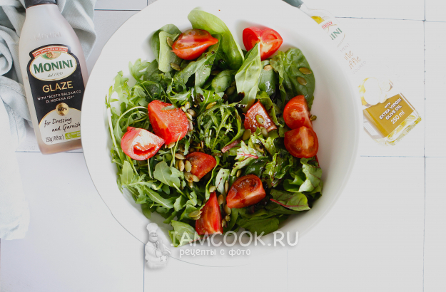 Перемешайте все ингредиенты руками, приправьте солью с травами. Заправьте салат оливковым маслом и сбрызните бальзамической пастой.