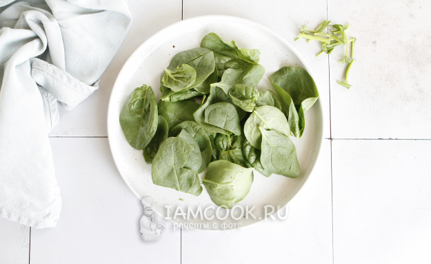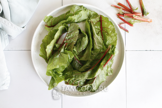 Удалите стебельки с листочков салата мангольд. Крупные листочки рекомендую порвать руками.