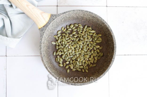 На сухой сковороде слегка обжарьте тыквенные семечки.