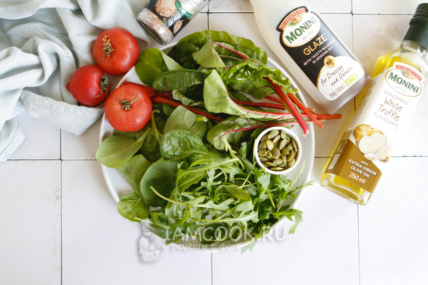 Перед вами весь набор ингредиентов, который необходим для приготовления салата из рукколы, мангольда и шпината.