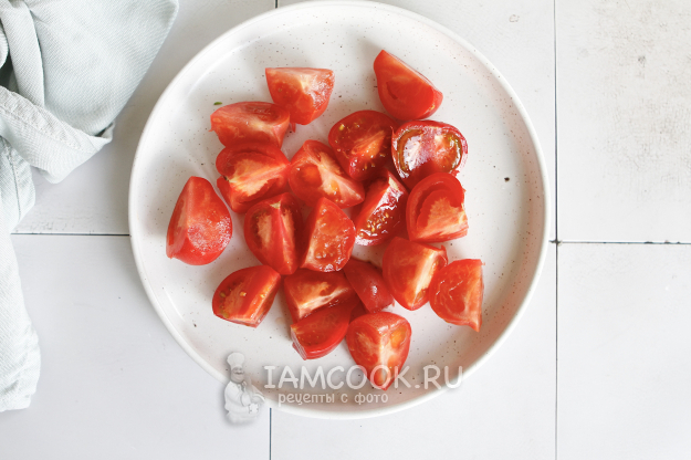 Помидоры тщательно промойте под проточной водой, высушите и нарежьте произвольно.