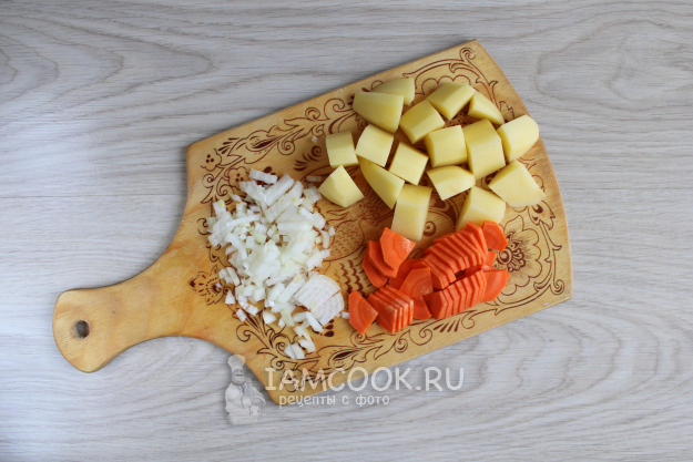 Для удмуртской ухи (по-камски) подготовьте ингредиенты по списку к рецепту. Про рыбу пояснила во вступлении, теперь - про овощи и дополнительные ингредиенты. Обязательно - лук, морковь, а картошка - это по желанию. Себе положу порцию без картошки, поэтому в суп её будет добавлено минимальное от указанного в ингредиентах.