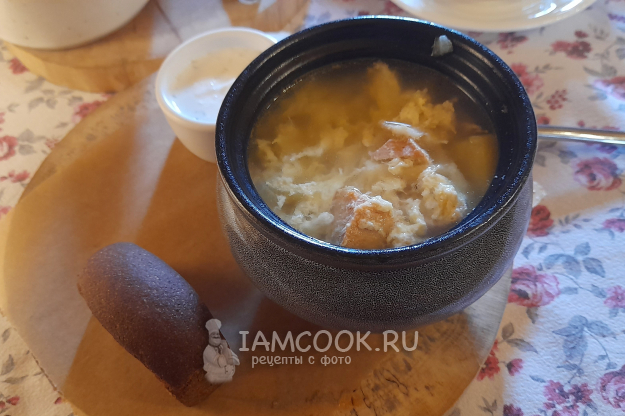 Яйца забрасываются в суп сырыми, а для пикантной кислинки предлагается зернистая горчица и/или сметана.