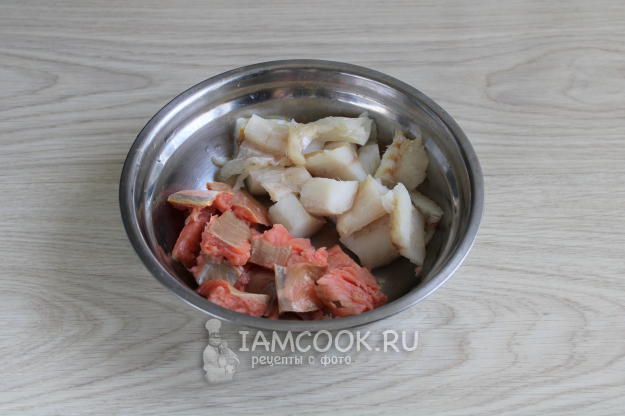 Все виды рыбного филе нарежьте на куски, слегка их посолите и забросьте в уху с практически готовыми овощами. Прибавьте огонь до максимума, чтобы добиться начала сильного кипения.