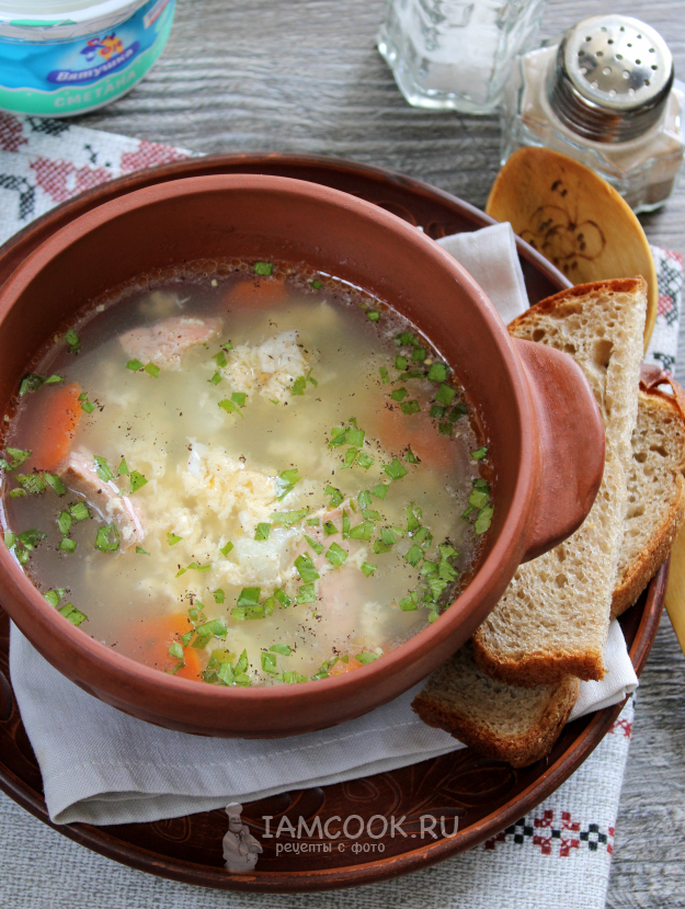 Яйца размешайте с порцией холодного бульона/воды. Влейте яичную массу во вновь закипевший суп. Перемешайте и поварите 1-1,5 минуты. Рыба уже сварилась в процессе закипания, а яйца схватятся быстро.