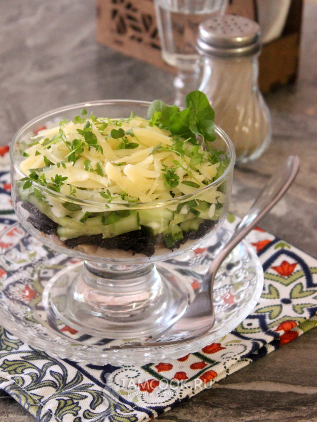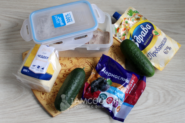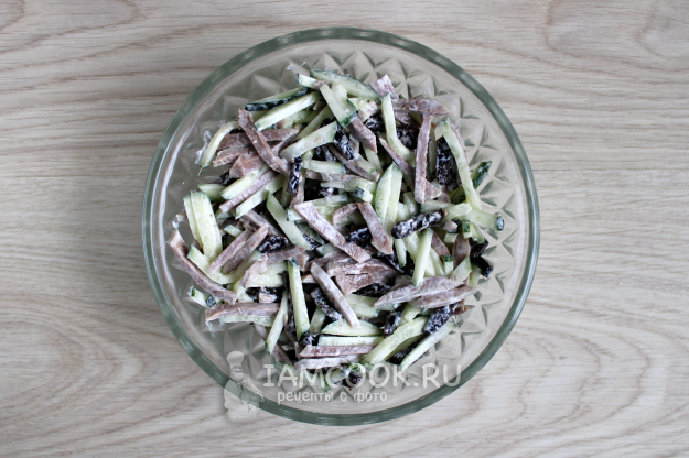 Возьмите на заметку и вариант приготовления салата слоями: язык, чернослив, майонез, огурец, сыр, зелень.