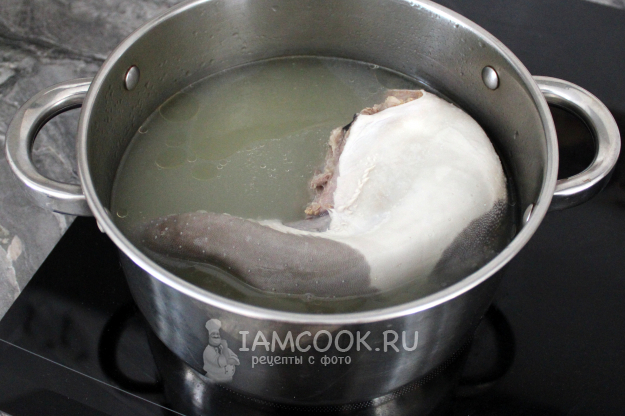Говяжий язык нужно сварить заранее. Для этого его сначала варят после закипания около трёх минут, затем сливают воду и варят в новой воде не менее двух часов. В конце варки воду с языком подсаливают и сопровождают специями. Готовый горячий язык помещают в холодную воду и снимают с него кожицу.