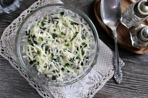 Сверху посыпьте салат свежей рубленой зеленью, например, луковым пером, микрозеленью или базиликом и тёртым сыром.