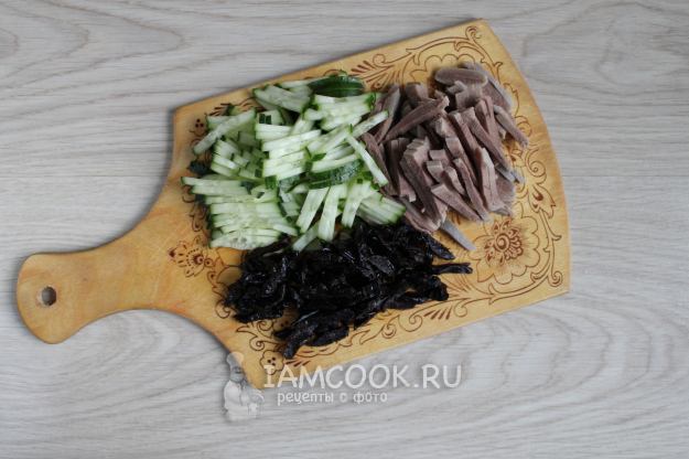 Для салата с говяжьим языком и черносливом подготовьте ингредиенты по списку к рецепту. Язык нужен уже готовый и охлажденный, сыр - обычный полутвердый, как для бутербродов. Чернослив потребуется вяленый, т.е. мягкий, а не сухой. В качестве свежей зелени подходят перо лука, петрушка, укроп, базилик, микрозелень.