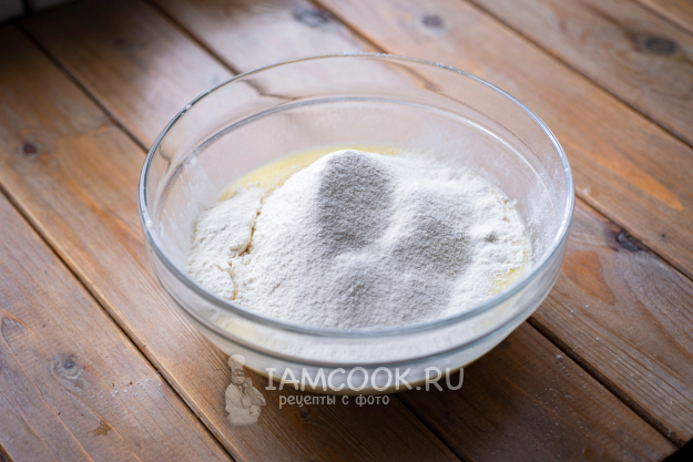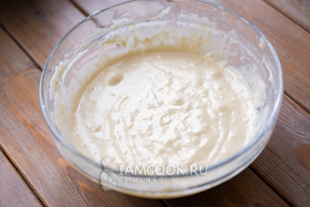 Перемешайте все эти ингредиенты ложкой или венчиком. В итоге должно получиться вязкое, однородное тесто, которое по консистенции способно падать "лентой" с ложки.