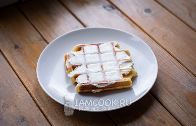 Смажьте одну из приготовленных венских вафель слоем сливочного сыра.