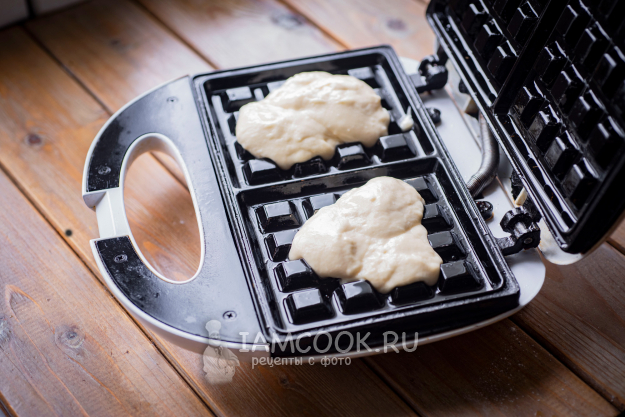 Смажьте растительным маслом рабочие поверхности электровафельницы и на каждую выложите примерно по 2 столовые ложки теста. Выпекайте вафли 2-3 минуты.