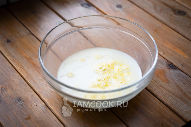 Приготовьте сначала венские вафли. В миску вбейте два яйца, взбейте их венчиком. Залейте молоком, перемешайте венчиком.