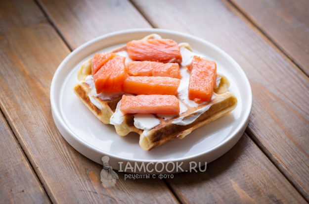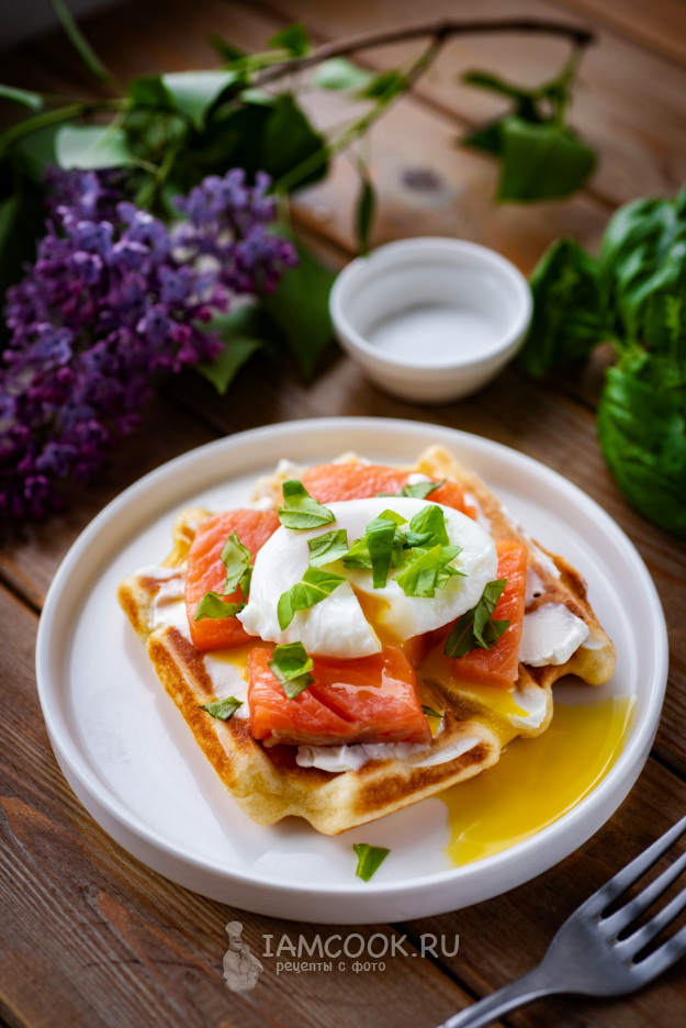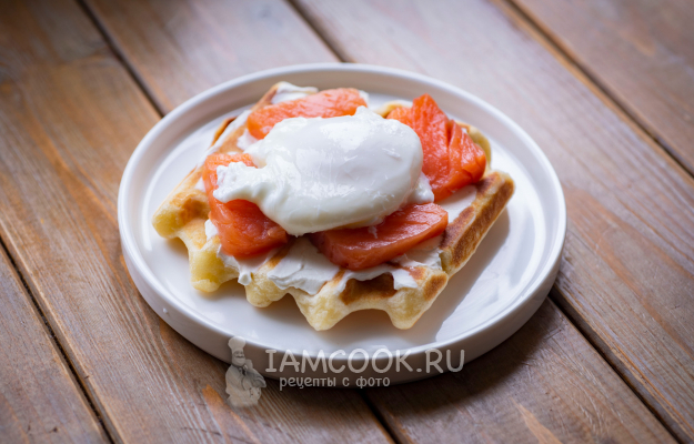 И переложите яйцо пашот на венскую вафлю, поверх малосольного лосося.