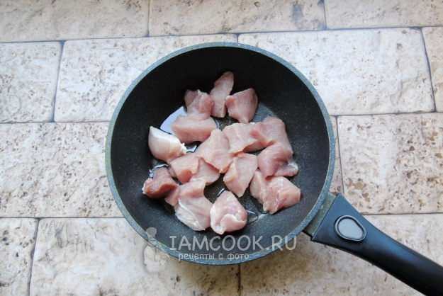Свинину помойте и нарежьте. Выложите на горячую сковороду с растительным маслом.