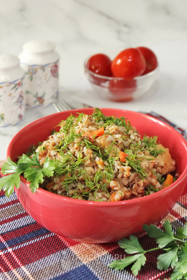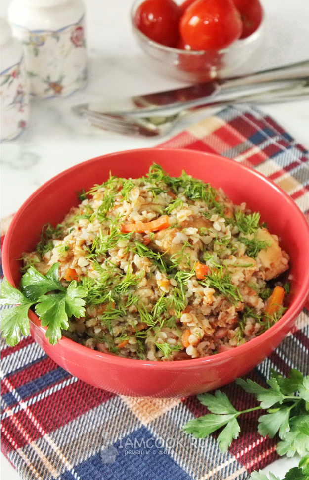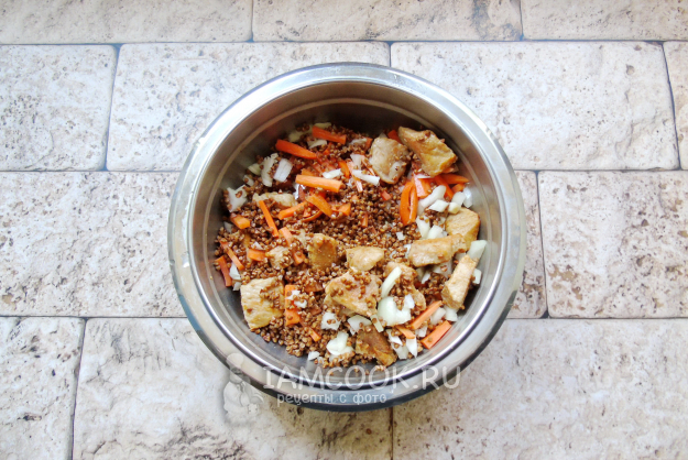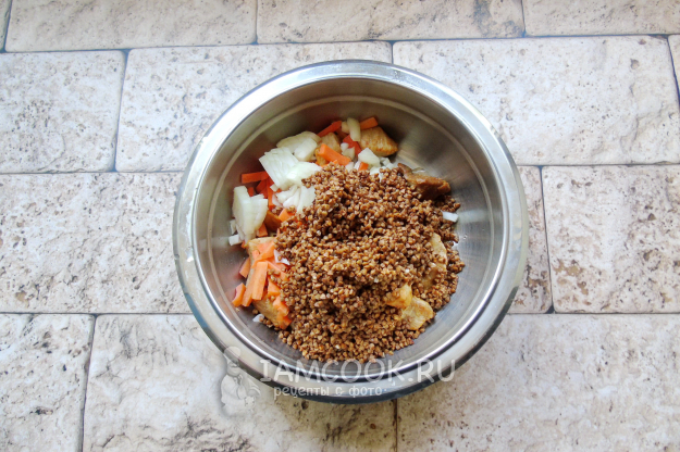 Гречку переберите, если нужно, и хорошо помойте. Добавьте в миску с мясом и овощами.