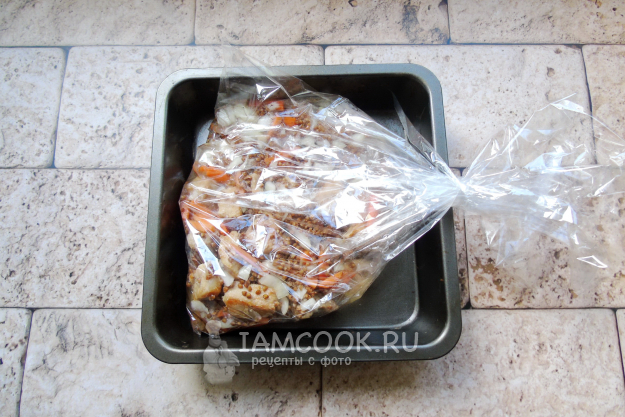 Рукав закрепите клипсой с одной стороны, выложите на противень или в форму для запекания. Заполните приготовленной смесью.