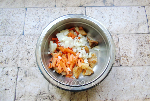 В миску выложите жареную свинину, лук и морковь.