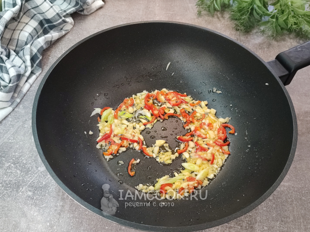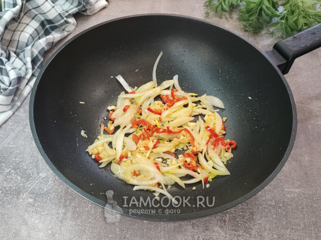 Выкладываем морковь, жарим пару минут, пока морковь не станет мягче.