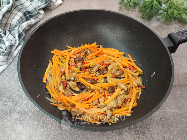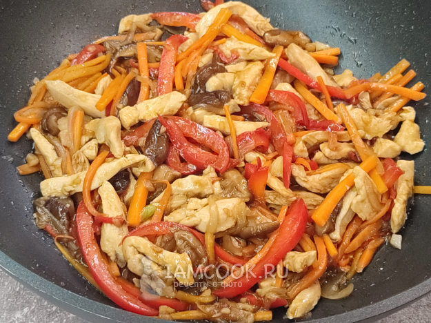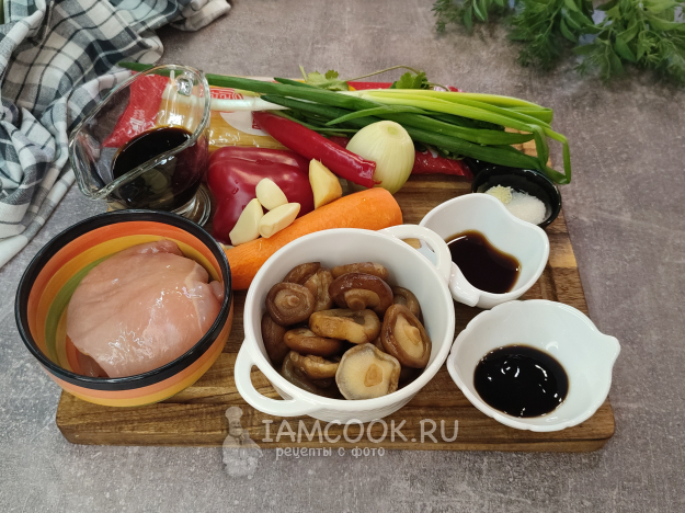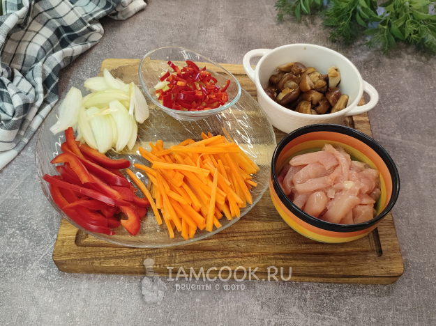 Сначала все подготовим. Лук, морковь, перец нарежьте соломкой, чеснок, имбирь, чили измельчите. Куриное филе нарежьте тонкими ломтиками, мелкие грибы оставьте как есть, крупные нарежьте на 2-3 части.
