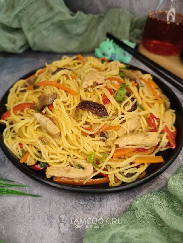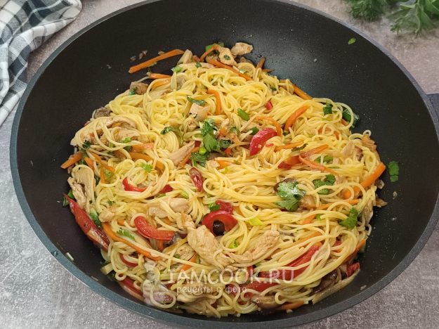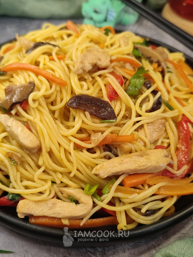 Лапша вок с курицей и грибами готова! Подавайте к столу сразу же!)