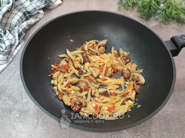 Соберите ингредиенты для приготовления лапши вок с курицей и грибами. Грибы подойдут как азиатские (муэр, эноки, еринги, шиитаке), так и более нам привычные (шампиньоны, вешенки), я взяла замороженные шиитаке. Овощи у меня самые банальные, вы можете дополнить блюдо кабачком, капустой, стручковой фасолью, например, будет только вкуснее.