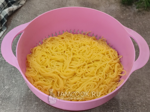 После варки промыть холодной водой, откинуть на дуршлаг. Лапша, кстати, вкусная, но характерного какого-то кукурузного вкуса я не почувствовала.