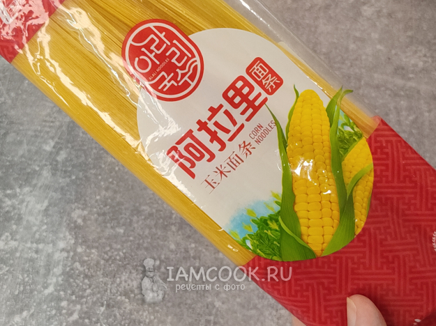 Лапшу сегодня взяла кукурузную, на пробу, так сказать)). Варится она не совсем привычно, ее нужно поместить сразу в кастрюлю с холодной водой и после закипания варить 4-6 минут.
