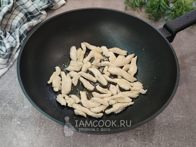 Жарить будем на сильном огне, постоянно помешивая. Разогрейте в сковороде масло, выложите курицу. Обжарьте до изменения цвета, зажаривать не надо. Переложите курицу в отдельную миску.