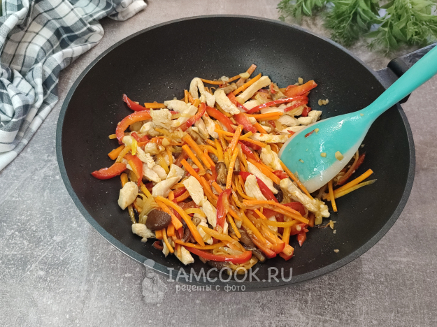 Затем добавим перец, обжарим пару минут, после вернем курицу обратно в сковороду.