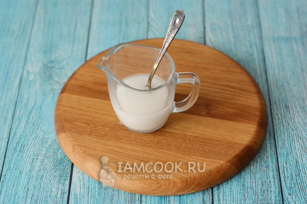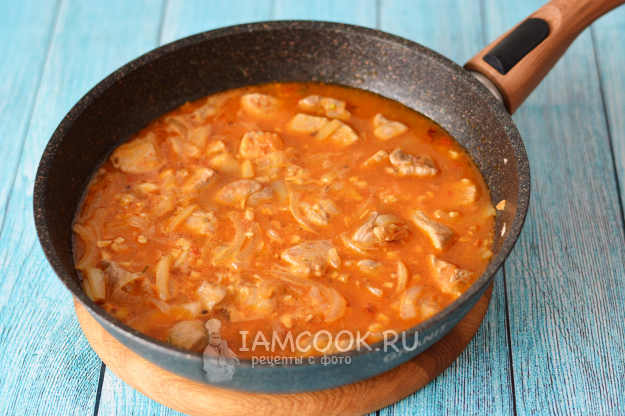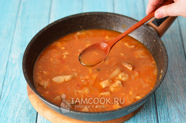 Чтобы подлива была ещё более шелковистой и густой, я предлагаю затянуть её крахмалом. Разведите пару чайных ложек крахмала в небольшом количестве воды (около 70 мл) и влейте в сковороду.