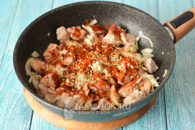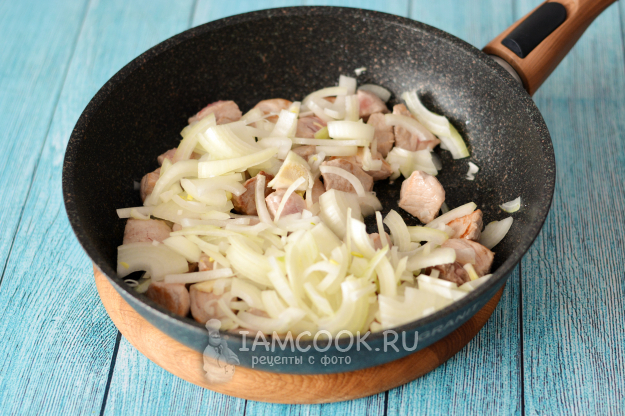 Лук отправьте в сковороду к свинине и обжаривайте ещё примерно пару-тройку минут, чтобы лук стал прозрачным. Золотить его сильно не нужно.