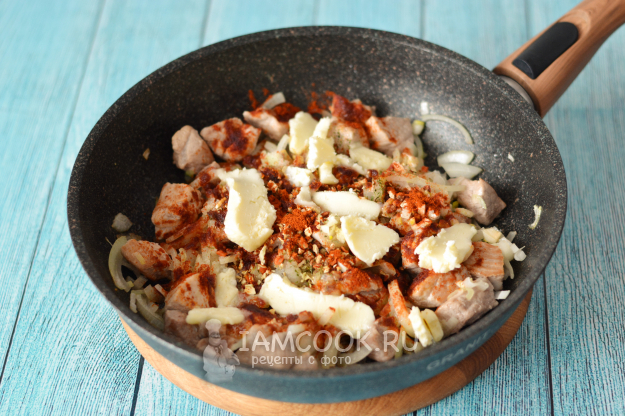 Нарежьте масло небольшими кусочками и выложите поверх мяса.