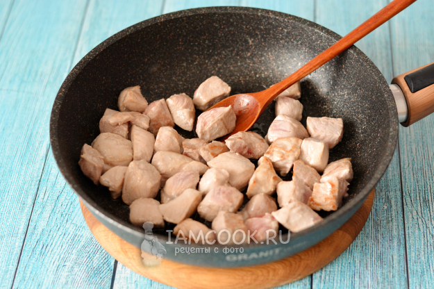 На сильном огне разогрейте сковороду с растительным маслом. В раскалённую сковороду отправьте кубики свинины и обжарьте, помешивая, примерно 3-5 минут, до румяных бочков.