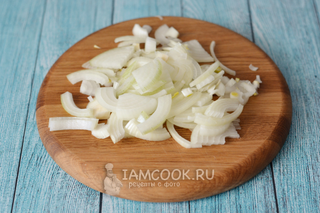 Лук нашинкуйте полукольцами или четверть-кольцами, в зависимости от размера луковицы.