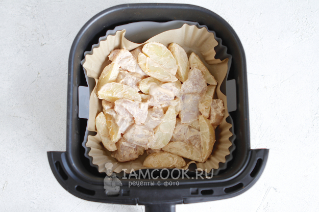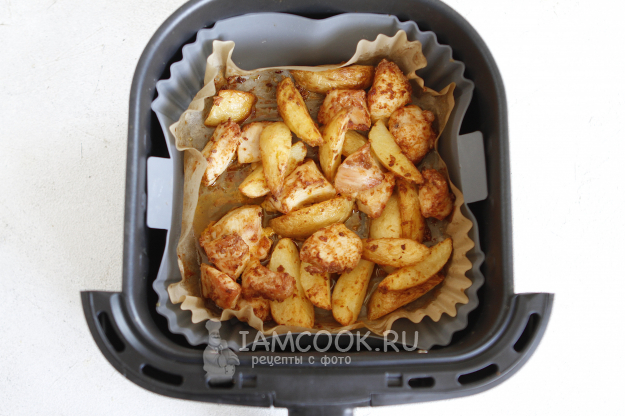 Чашу аэрогриля застелите пергаментом или специальным вкладышем, выложите картофель с курицей.